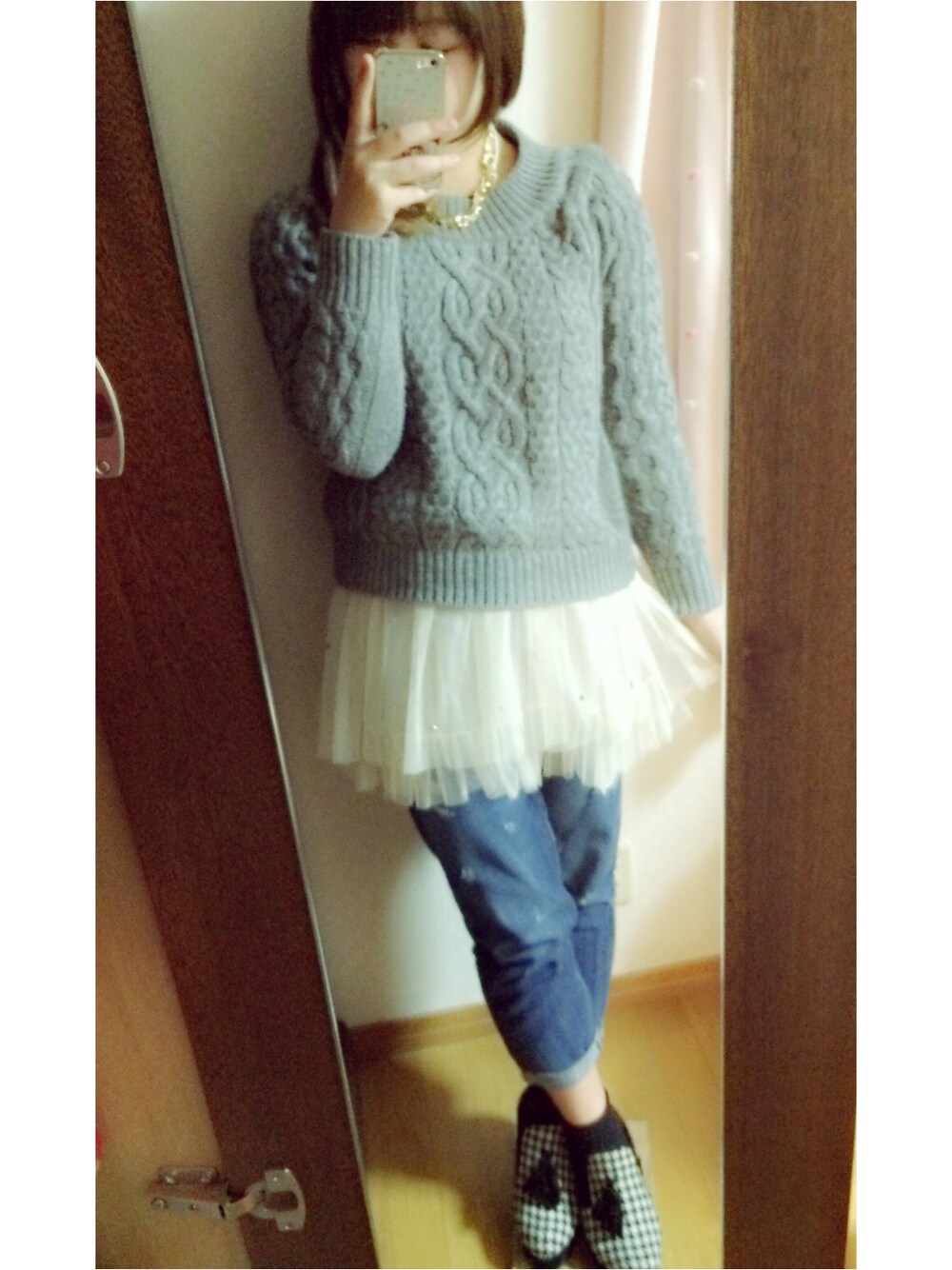 シンプルなニットとボーイフレンドデニムに リメイクのチュールスカートをはさみました。 小さなビジューとかスパンコールが散らばっててお気に入り。 珍しくヒール。