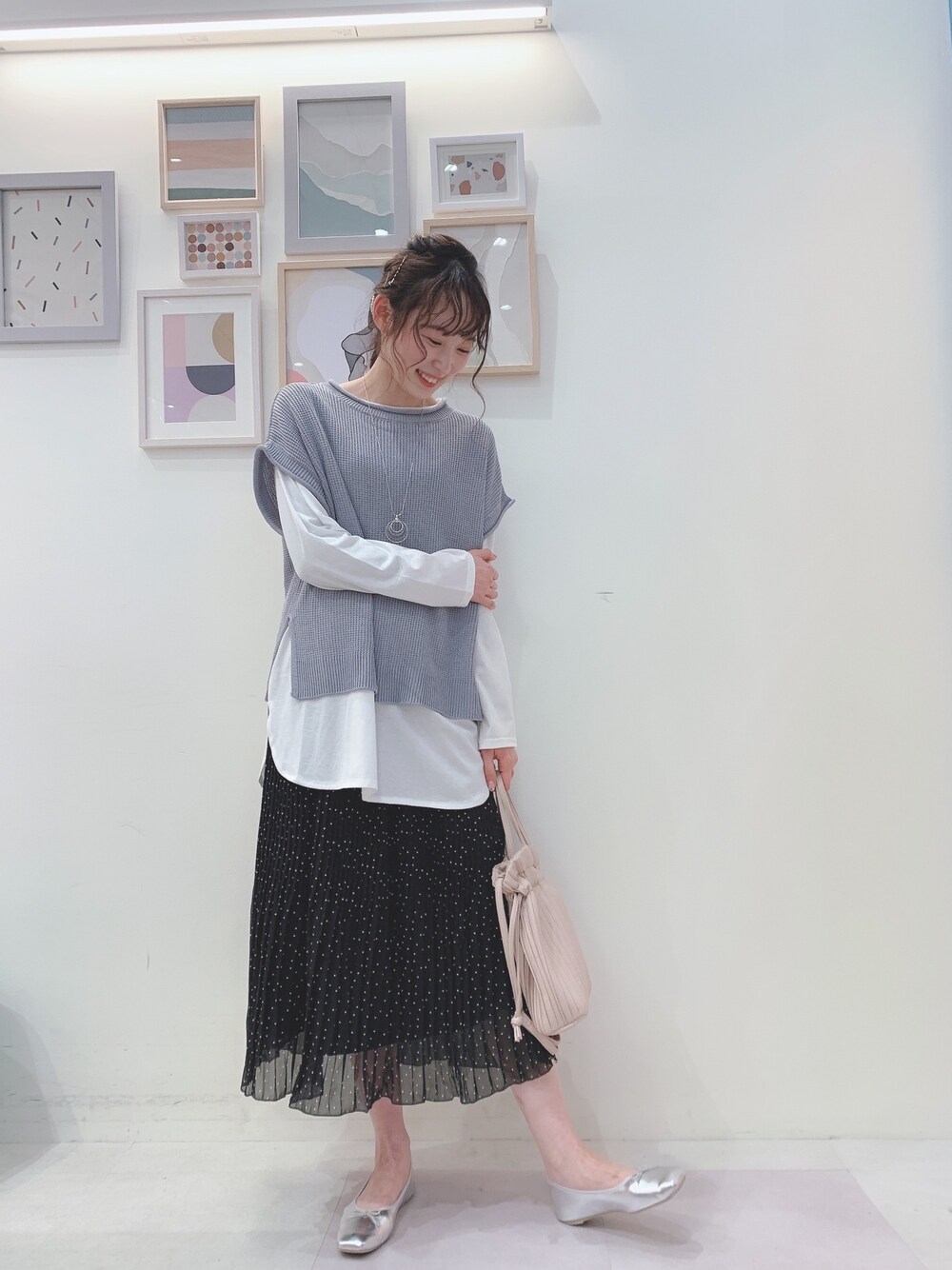 ご覧いただきありがとうございます♡ いいね、お気に入り感謝です☺︎ お返ししに行きます! 麻タッチのサラッとしたニットベストと透け感のあるドットのスカートで春らしいゆるコーデに。 足元はシルバーのバレエシューズでトレンドカラーも取り入れて今年らしさも出していきましょう♡ instagram↪︎chi__nk フォローまってます✿