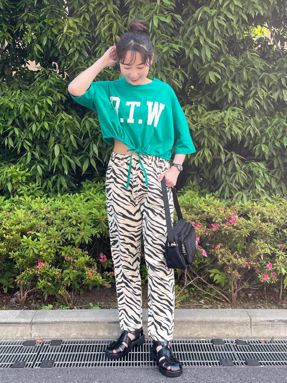 ご覧いただきありがとうございます♡ 【coordinate point】 ゼブラ柄のパンツが存在感たっぷりのカジュアルスタイル。 ミニ丈のTシャツは裾がギャザーになっていて絞れるデザインがウエストマークの効果ももたらしてくれて脚長効果も◎ サンダルと小物はブラックでスッキリ見せも意識しました。 【Instagram】 @chi__nk ▶︎my account @shoolarue_official ▶︎ Insta LIVE 毎週木曜20時〜出演中 是非チェックしてくださいねー✨