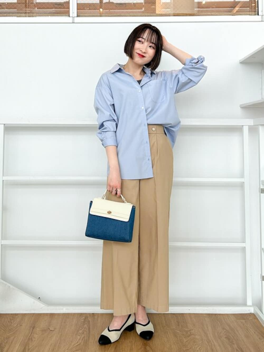 シャツ一枚をボタンを開けてハーフインで着こなしたこなれたスタイル。 オフィスカジュアルにもおすすめです。 【Instagram】 my account▶︎ @chi__nk Insta LIVE▶︎ @shoolarue_official 毎週木曜20時〜出演中 インスタも是非チェックお願いします✨