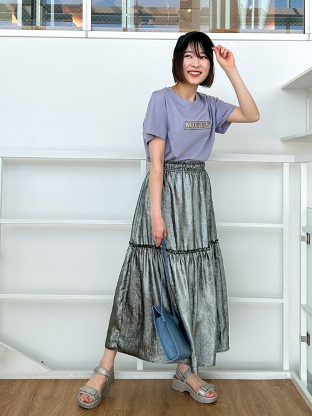 カラーのTシャツをトレンドライクに着こなしたくてシルバーのキラキラのスカートと合わせました。 シンプルなワンツーコーデでもカラーTシャツと箔プリントの素材でこなれた印象になります。 小物はスポサンやキャップでカジュアルライクにまとめました。 【Instagram】 my account▶︎ @chi__nk Insta LIVE▶︎ @shoolarue_official 毎週木曜20時〜出演中 インスタも是非チェックお願いします✨