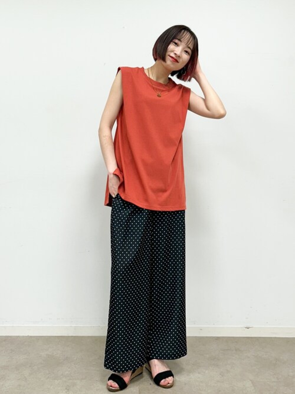オレンジ系の明るいノースリーブのトップスを主役に、ボトムやサンダルは黒でスッキリまとめました。 【Instagram】 my account▶︎ @chi__nk Insta LIVE▶︎ @shoolarue_official 毎週木曜20時〜出演中 インスタも是非チェックお願いします✨