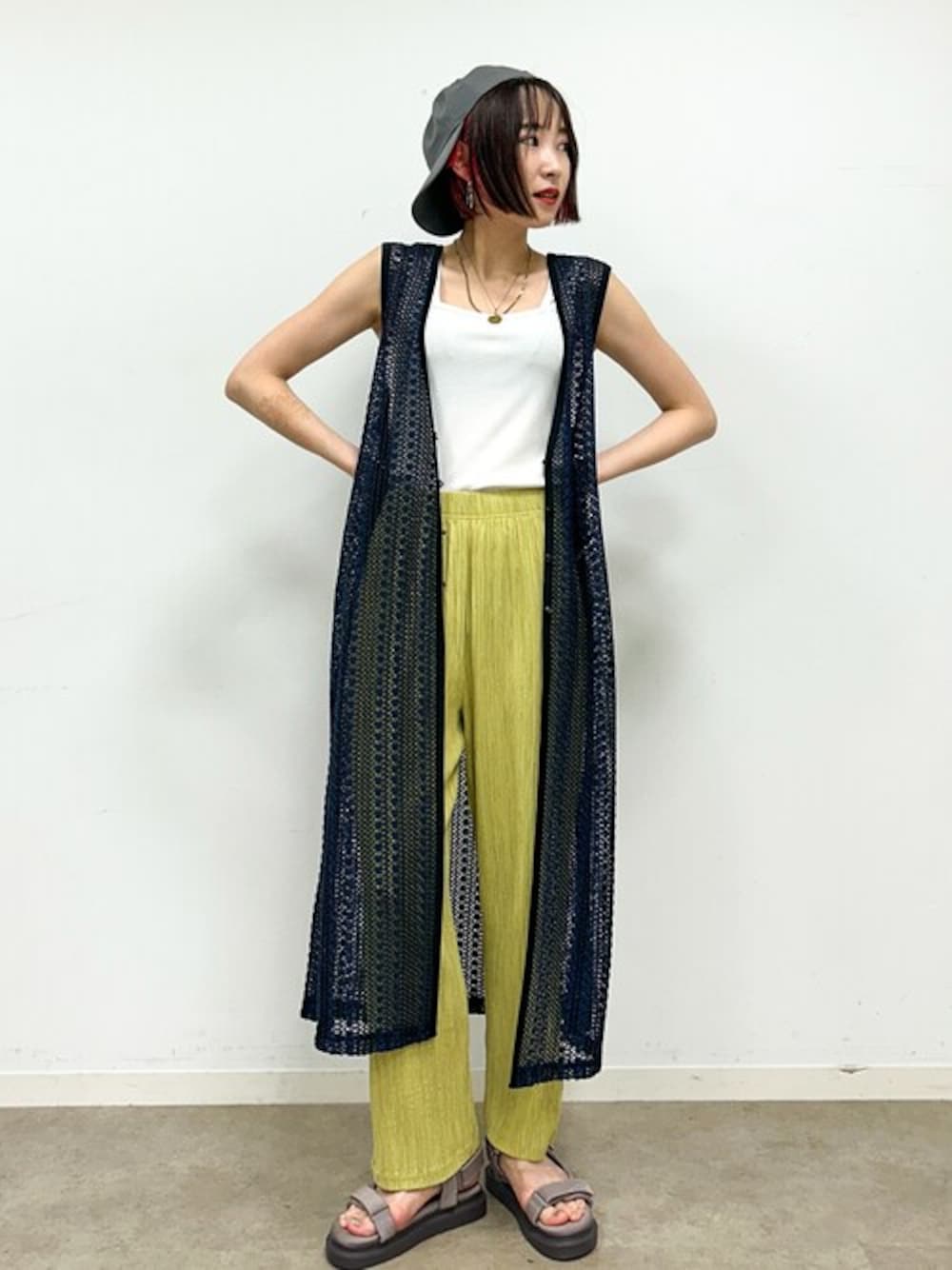 ネイビーのニットジレにイエローのパンツを合わせてさりげなくカラーで遊んだコーディネート。 ニットジレが長いのでその分インナーはタンクトップにして腕を出して抜け感のバランスをとった着こなしに。 【Instagram】 my account▶︎ @chi__nk Insta LIVE▶︎ @shoolarue_official 毎週木曜20時〜出演中 インスタも是非チェックお願いします✨
