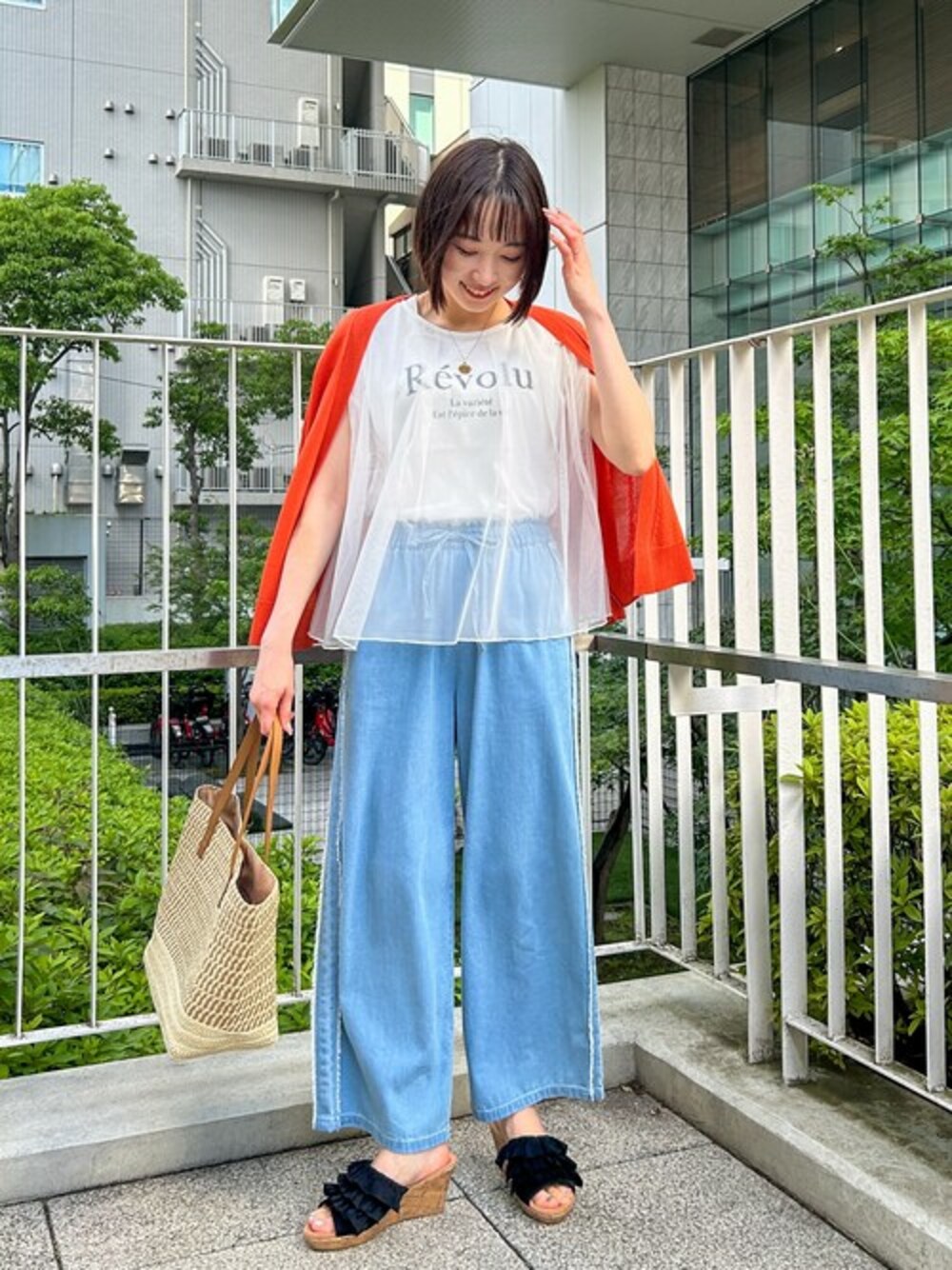 オレンジのカーディガンを中心に白トップスとデニムで他はシンプルに。 トレンドのチュール素材やフリンジデニムなど素材で今っぽさをプラスしました。