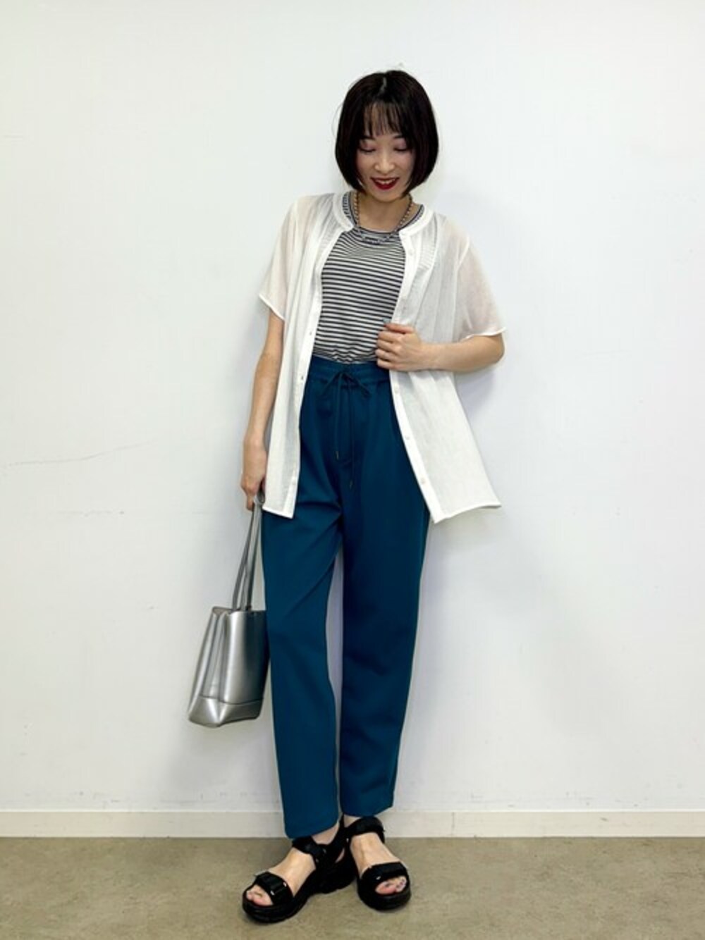 白のシャツとブルーグリーンで夏の涼しげさを意識した大人カジュアルスタイルです。 【Instagram】 my account▶︎ @chi__nk Insta LIVE▶︎ @shoolarue_official 毎週木曜20時〜出演中 インスタも是非チェックお願いします✨