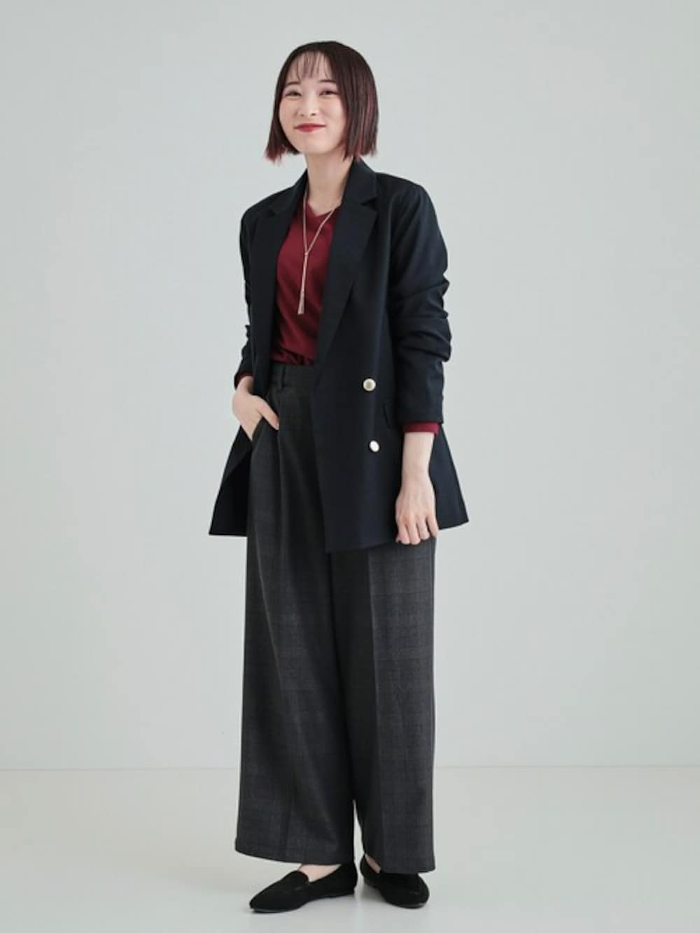 金ボタンのジャケットとチェック柄のワイドパンツはダークカラーでスッキリ大人っぽく。 インナーに秋らしいボルドーを差し色でプラスしました。 【Instagram】 my account▶︎ @chi__nk Insta LIVE▶︎ @shoolarue_official 毎週木曜20時〜出演中 インスタも是非チェックお願いします✨