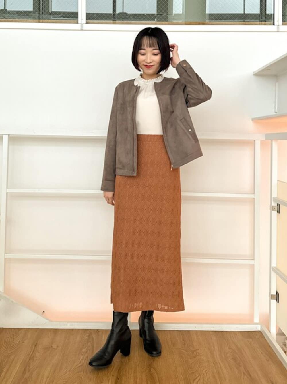 オレンジのスカートを主役に暖色系でまとめたきれいめスタイルです。足元は黒のブーツで締めてスッキリ見えも忘れずに。 【Instagram】 my account▶︎ @chi__nk Insta LIVE▶︎ @shoolarue_official 毎週木曜20時〜出演中 インスタも是非チェックお願いします✨