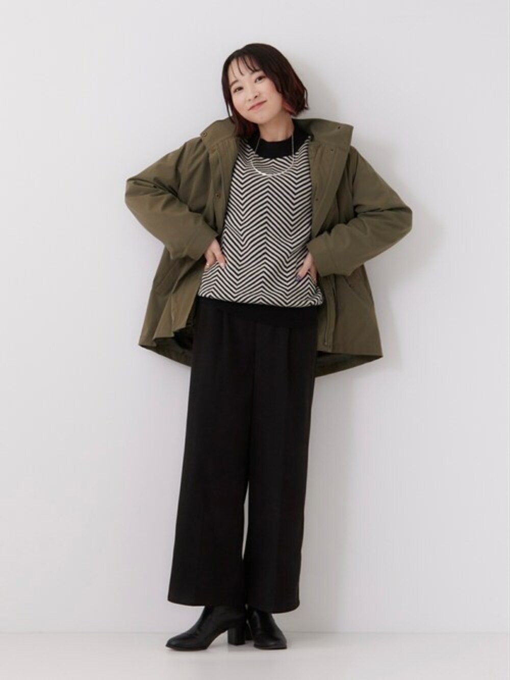 モノトーンの柄ニットコーデにカジュアルなブルゾンを羽織ったモードカジュアルなスタイル。 【Instagram】 my account▶︎ @chi__nk Insta LIVE▶︎ @shoolarue_official 毎週木曜20時〜出演中 インスタも是非チェックお願いします✨
