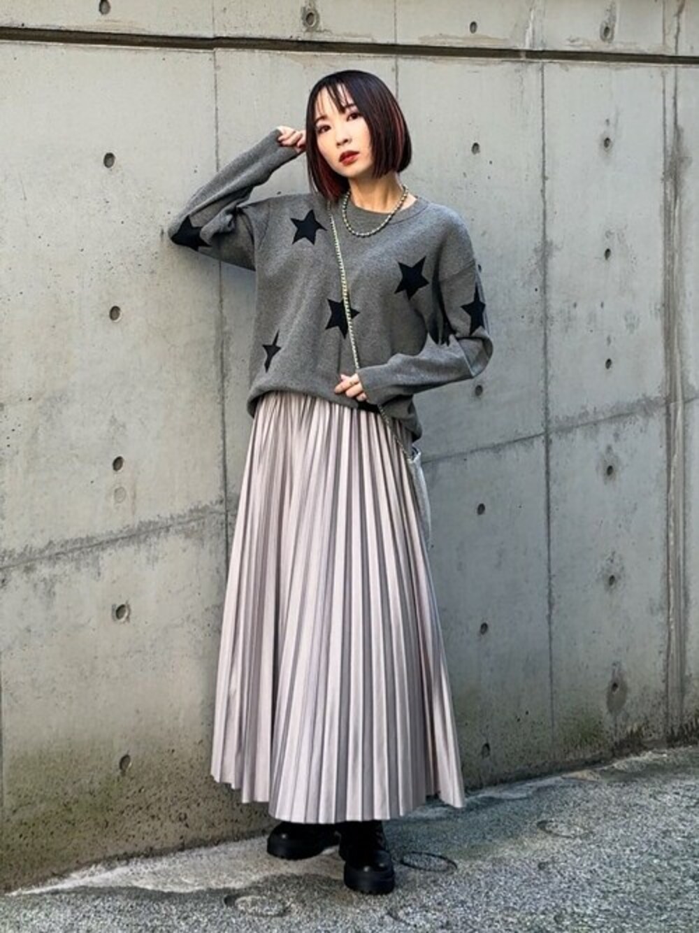 色味のトーンが違うグレーで合わせたワントーンコーデ。 星柄のカジュアルな印象と光沢感が上品なプリーツスカートで合わせたミックステイストな着こなしです。 足元はレースアップブーツでこなれ感とカジュアルな印象をプラスしました。 【Instagram】 my account▶︎ @chi__nk Insta LIVE▶︎ @shoolarue_official 毎週木曜20時〜出演中 インスタも是非チェックお願いします✨