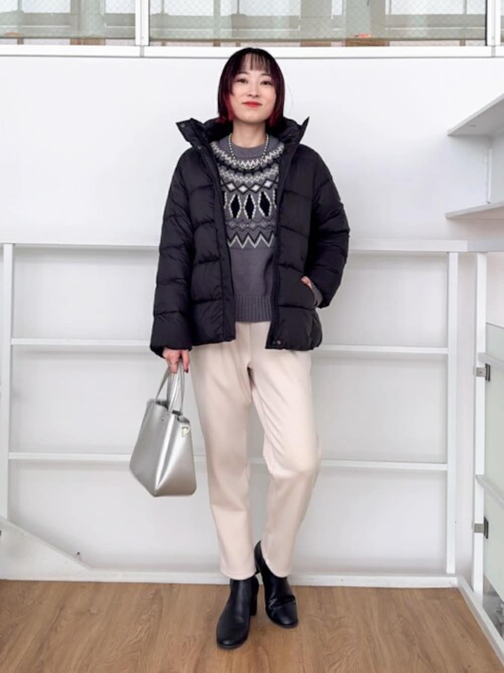 モノトーンで落ち着いたカラー使いにしながらも柄のニットを選んでメリハリある着こなしを意識しました。 トレンドのシルバーのバッグをプラスしたのもポイントです。 【Instagram】 my account▶︎ @chi__nk Insta LIVE▶︎ @shoolarue_official 毎週木曜20時〜出演中 インスタも是非チェックお願いします✨