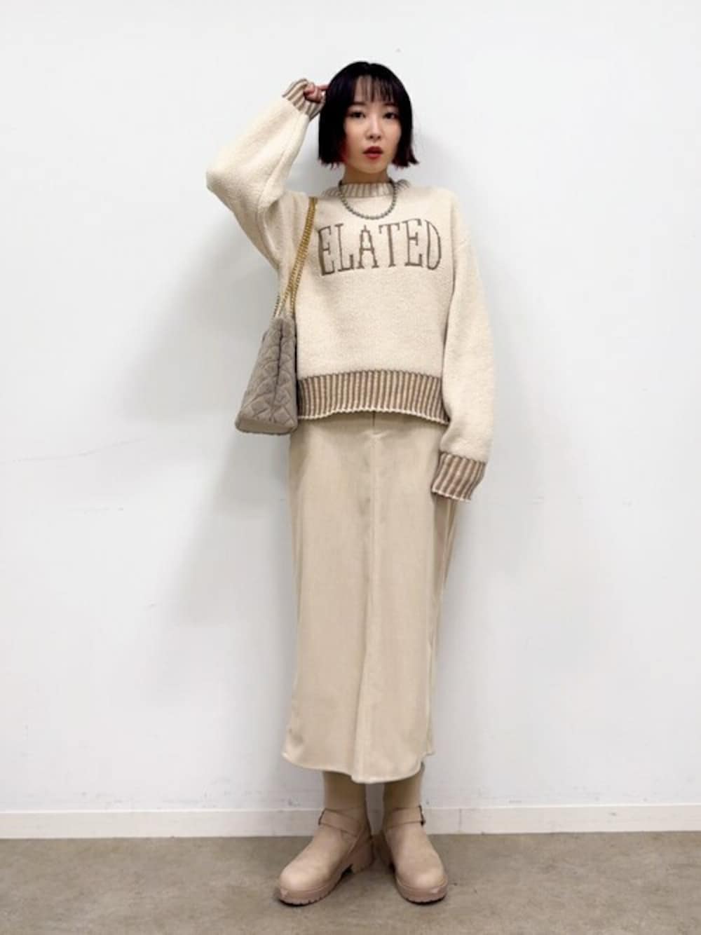 着丈が長すぎないので、アウトスタイルが苦手な私でもバランスよく着られました。 柔らかいアイボリーはワントーンで着こなすのがおしゃれ見えのコツ。 ニットのリブデザインの色が変わっているおかげで、のっぺりとせず同系色のボトムと合わせてもメリハリある着こなしが叶います。 【Instagram】 my account▶︎ @chi__nk Insta LIVE▶︎ @shoolarue_official 毎週木曜20時〜出演中 インスタも是非チェックお願いします✨