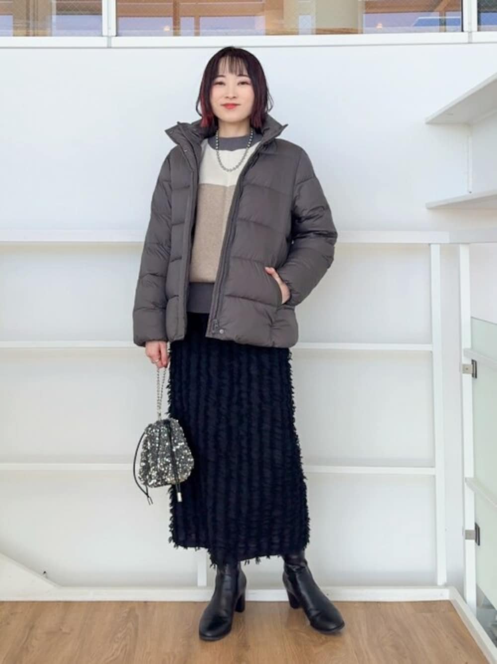 ニットに入っているグレーのラインとアウターのグレーをリンクさせました。 ナロースカートの縦ラインとありすっきりと統一感あるスタイルに。 【Instagram】 my account▶︎ @chi__nk Insta LIVE▶︎ @shoolarue_official 毎週木曜20時〜出演中 インスタも是非チェックお願いします✨