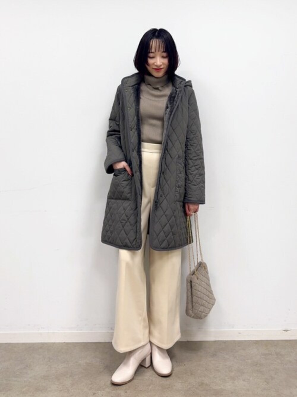 chika(SHOO・LA・RUE)のその他アウター「◆【フード取り外し可/撥水加工】自然にくびれる あったかダイヤ柄キルトコート」を使ったコーディネート