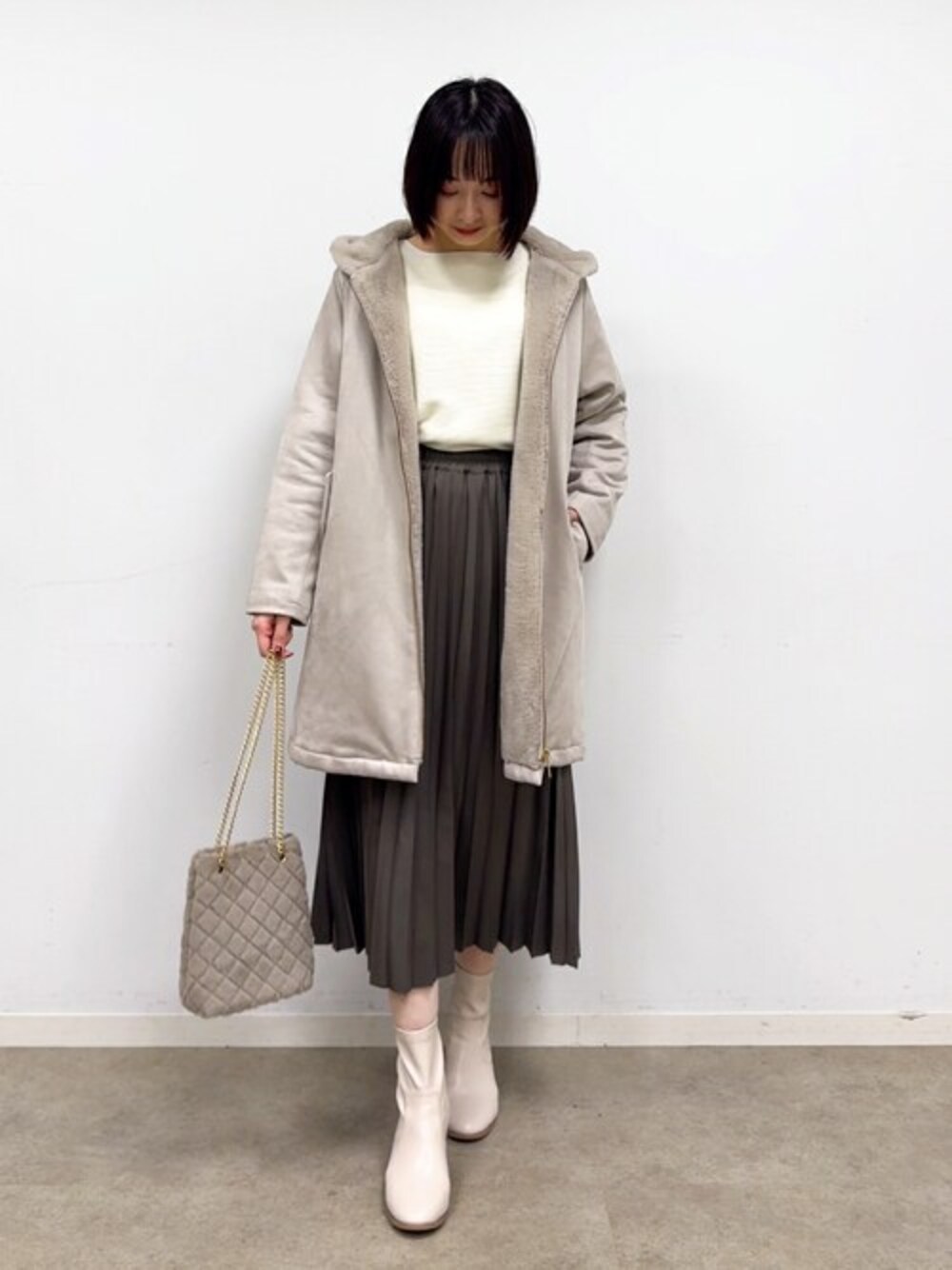 ワントーンに近いニュアンスカラーで柔らかい印象にまとめたフェミニンなスカートスタイル。 裏地がファー素材のコートに合わせてバッグもファーのチェーンバッグを選びました。 【Instagram】 my account▶︎ @chi__nk Insta LIVE▶︎ @shoolarue_official 毎週木曜20時〜出演中 インスタも是非チェックお願いします✨
