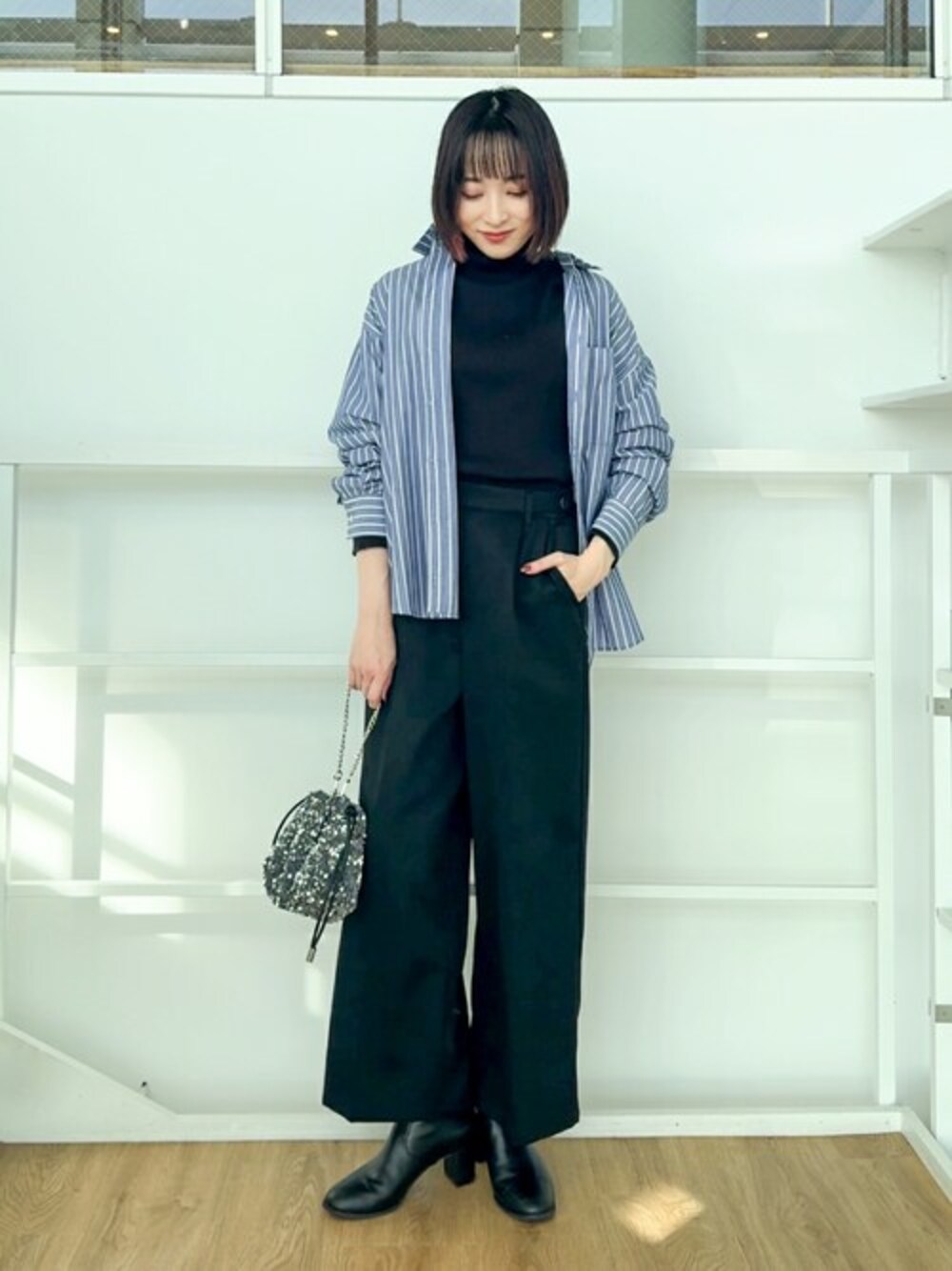 タートルネックの上からシャツを羽織ったレイヤードスタイル。 ボタンは全部開けて羽織ったり、半分ほどボタンを留めて着こなしにアレンジを加えるのもおすすめです。