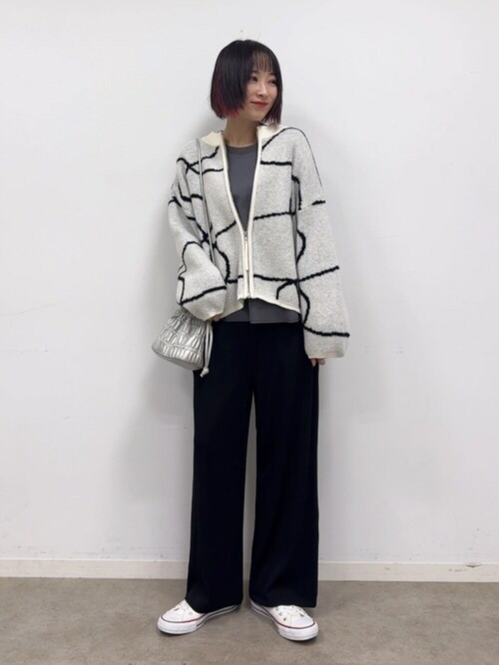 ゆるっとしたダブルZIPのカーディガンを上だけファスナーを大きく開けてルーズな着こなしに。 モノトーンで大人っぽくまとめました。 ※シューズはスタッフ私物です 【Instagram】 my account▶︎ @chi__nk Insta LIVE▶︎ @shoolarue_official 毎週木曜20時〜出演中 インスタも是非チェックお願いします✨
