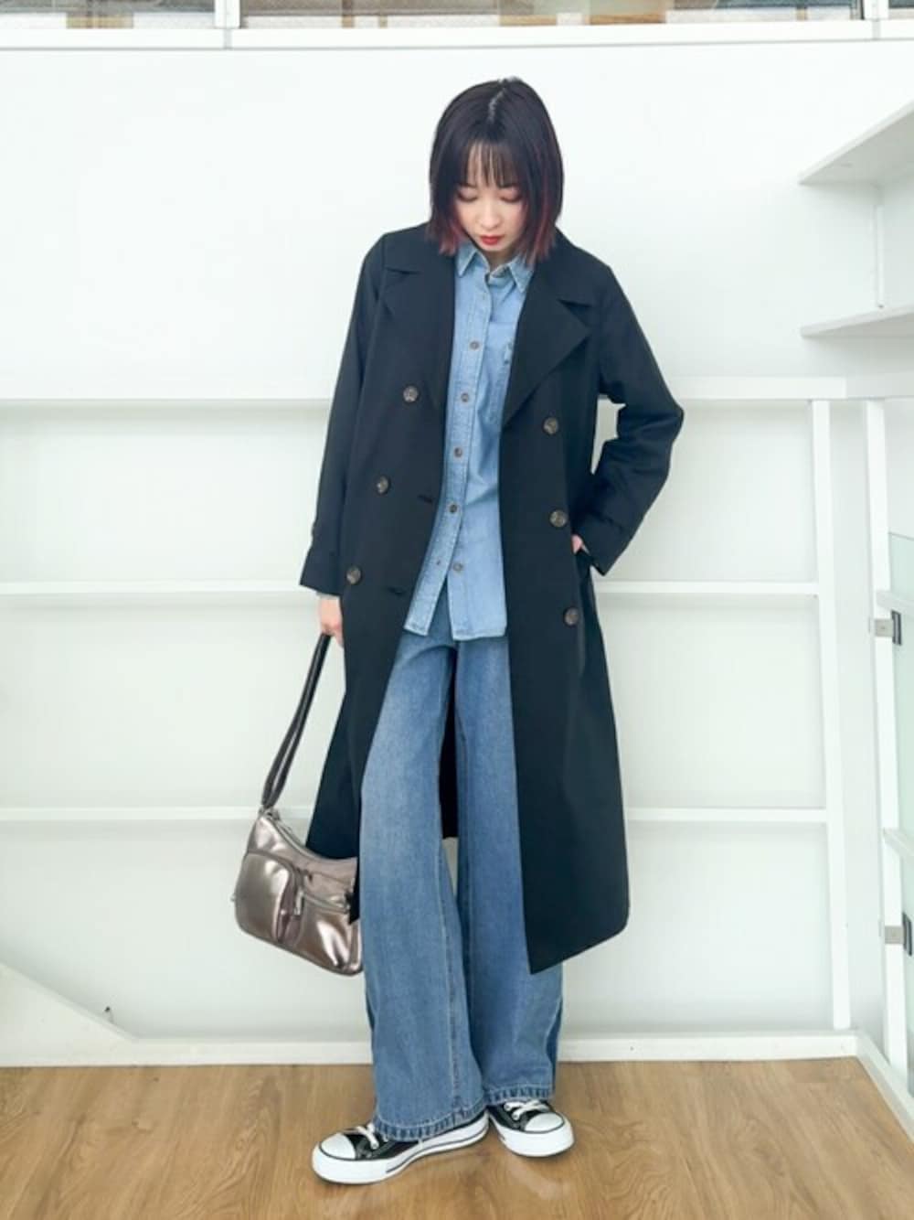 黒のトレンチコートをカッコよく大人カジュアルに着たくて、デニムコーデと合わせました。 デニムシャツはアウトスタイルで着ているので重くならないよう下のボタンを数個開けています。 ※シューズはスタッフ私物です 【Instagram】 my account▶︎ @chi__nk Insta LIVE▶︎ @shoolarue_official 毎週木曜20時〜出演中 インスタも是非チェックお願いします✨