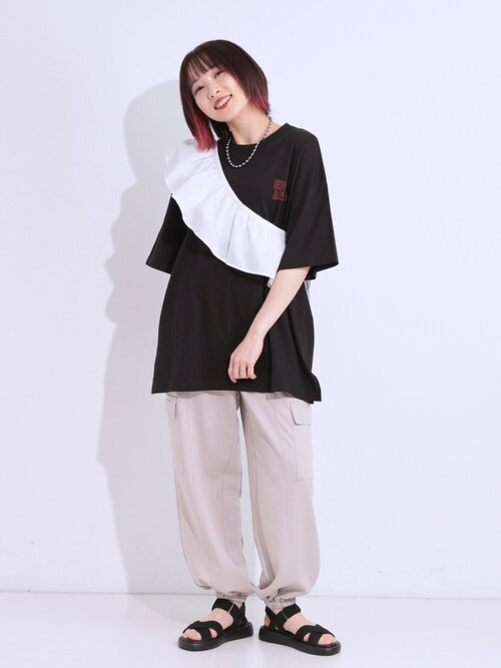 【スタイリングポイント】 シャツの取り外しできるフリルサッシュをTシャツにプラスしてアレンジした着こなしに。 ゆるっとしたカーゴパンツと合わせてアウトスタイルにしてもフリルサッシュがコーデにメリハリを与えてくれます。 ※アクセサリーはスタッフ私物です ※シューズは近日発売予定 【Instagram】 my account▶︎ @chi__nk Insta LIVE▶︎ @shoolarue_official 毎週木曜20時〜出演中 インスタも是非チェックお願いします✨