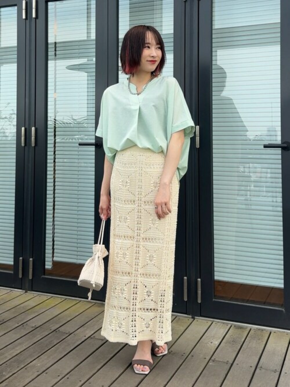 【スタイリングポイント】 すとんと落ち感のあるクロシェ編みのスカートにゆったりシャツを合わせた着こなしに。 シャツは前だけタックインすることで後ろはヒップを隠しながら前から見るとすっきりと脚長効果を期待できます。 ※アクセサリーはスタッフ私物です 【Instagram】 my account▶︎ @chi__nk Insta LIVE▶︎ @shoolarue_official 毎週木曜20時〜出演中 インスタも是非チェックお願いします✨