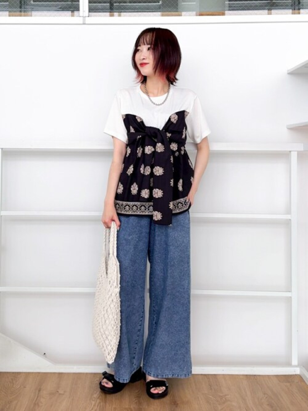 【スタイリングポイント】 デザイン性があるスカーフ巻き風のTシャツにはシンプルにデニムと合わせた大人カジュアルスタイルがおすすめです。 胸下でスカーフを絞ったようなデザインになっているのでワイドデニムでもバランスよく着こなせます。 ※アクセサリーはスタッフ私物です 【Instagram】 my account▶︎ @chi__nk Insta LIVE▶︎ @shoolarue_official 毎週木曜20時〜出演中 インスタも是非チェックお願いします✨