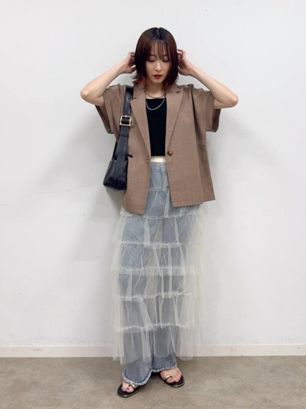 【スタイリングポイント】 半袖ジャケットとデニムのシンプルコーデにチュールスカートをレイヤードして華やかさをプラスしました。 ※バッグは参考商品です