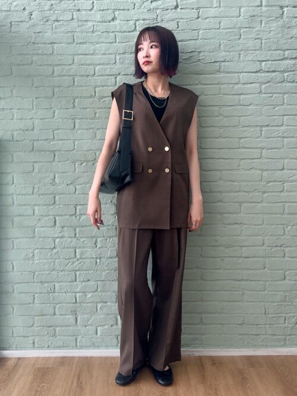 【スタイリングポイント】 ダブルボタンがシックでこなれ見えするゆったりめのジレはボタンを閉じてすっきりと着こなし。 ブラックの小物でクラシカルな印象もプラスしました。 【Instagram】 my account▶︎ @chi__nk Insta LIVE▶︎ @shoolarue_official 毎週木曜20時〜出演中 インスタも是非チェックお願いします✨