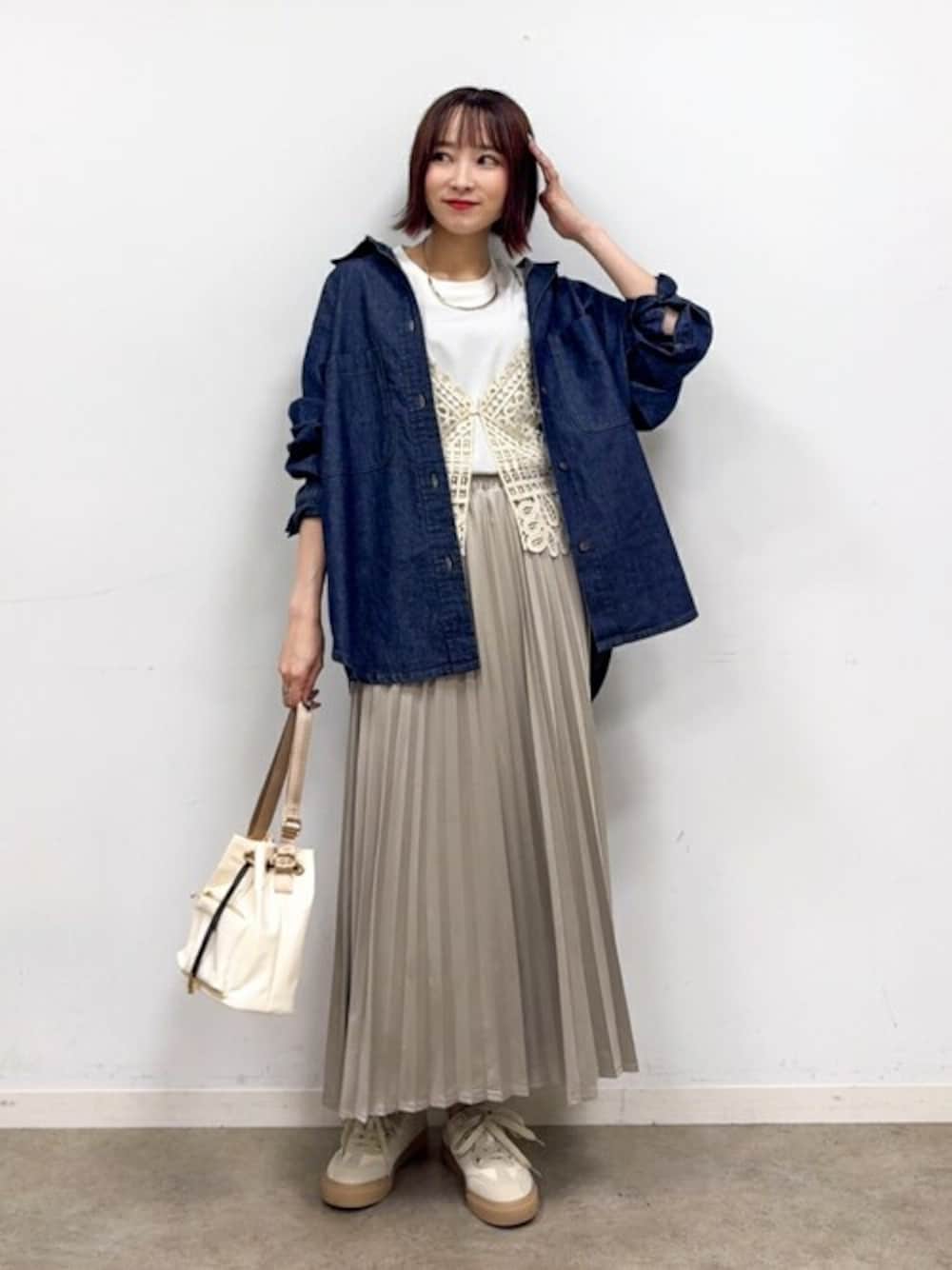 【スタイリングポイント】 女性らしいワントーンコーデにデニムのシャツを羽織ってカジュアルダウンさせました。 【Instagram】 my account▶︎ @chi__nk Insta LIVE▶︎ ワールドオンラインストア内 LIVE SHOPPING 毎週木曜20時~出演中 是非チェックお願いします✨