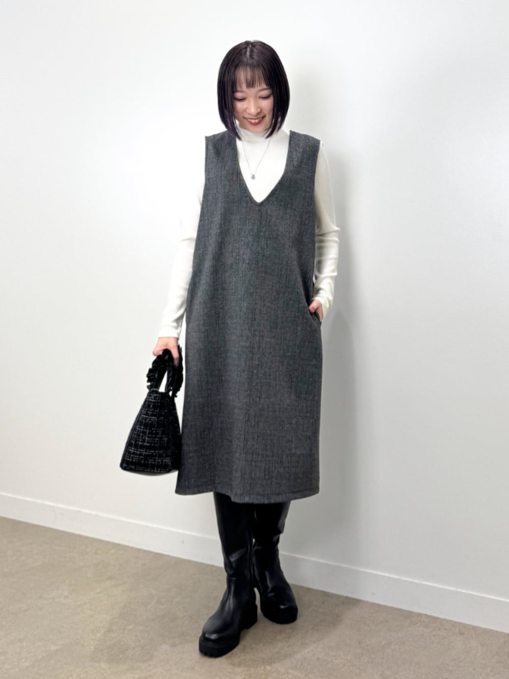 【スタイリングポイント】 着丈が短めのジャンスカなので、ロングブーツと合わせました。 シンプルになりすぎないよう、バッグはツイード調のバッグを合わせました。 【Instagram】 my account▶︎ @chi__nk Insta LIVE▶︎ ワールドオンラインストア内 LIVE SHOPPING 毎週木曜20時~出演中 是非チェックお願いします✨