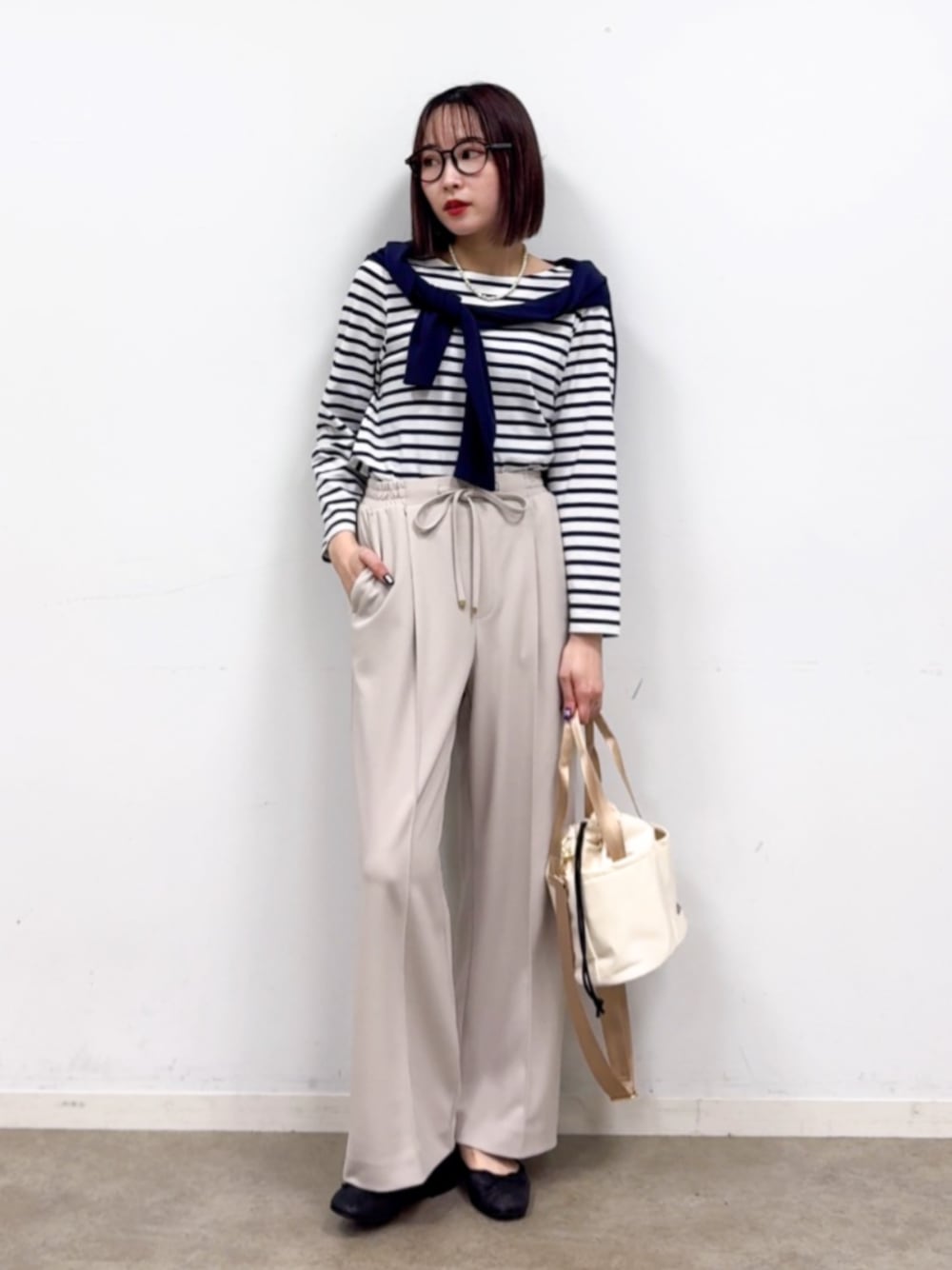 【スタイリングポイント】 明るいライトベージュのパンツをネイビーのボーダーTシャツとカーディガンで合わせた大人カジュアルスタイルに。 カーディガンの肩掛けと眼鏡をかければ目線を上に誘導できて明るいカラーのワイドパンツも バランスよく着こなせます。 ※メガネはスタッフ私物です 【Instagram】 my account▶︎ @chi__nk Insta LIVE▶︎ ワールドオンラインストア内 LIVE SHOPPING 毎週木曜20時~出演中 是非チェックお願いします✨