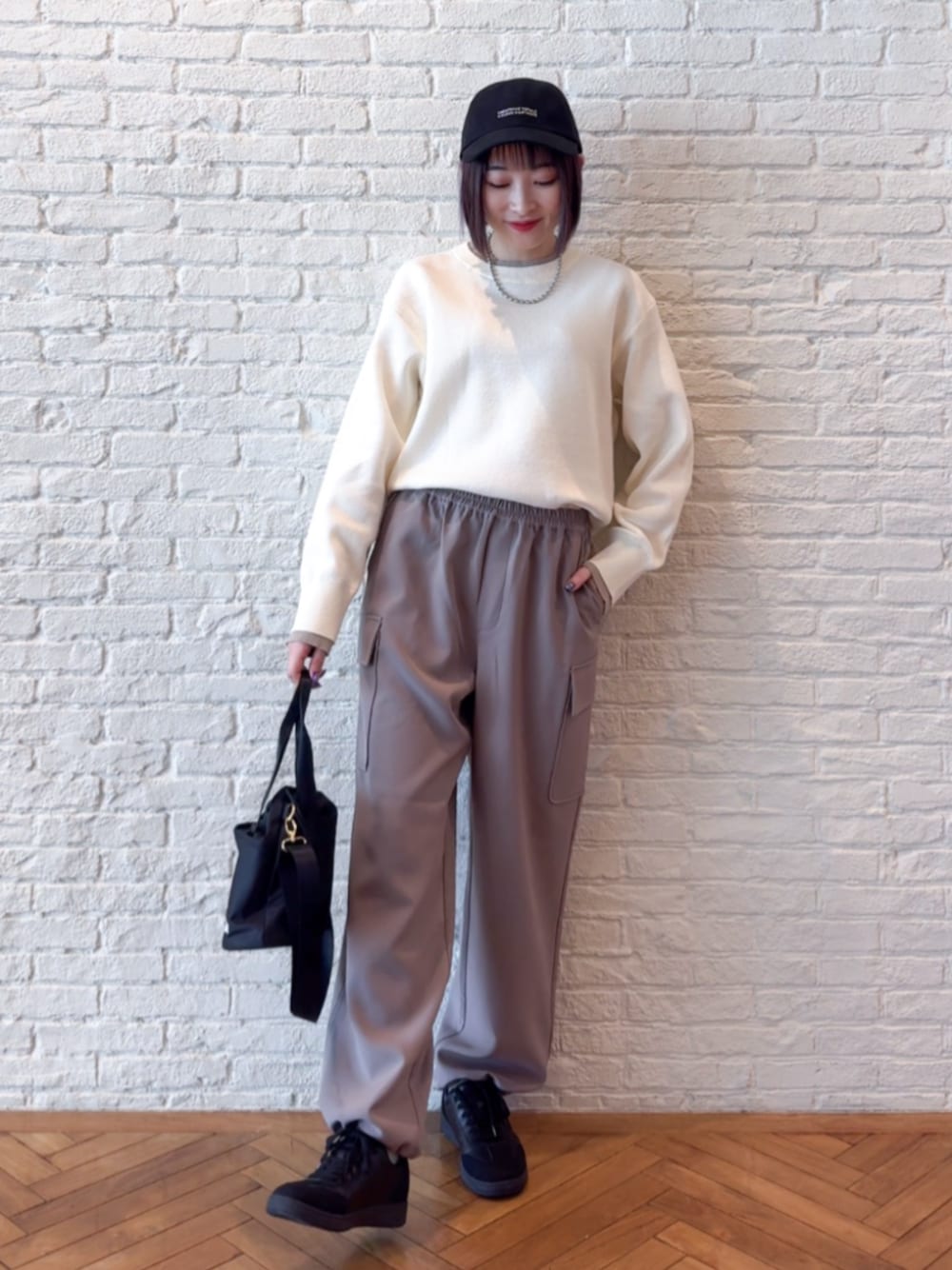 【スタイリングポイント】 配色ニットのベージュとパンツのカラーを揃えました。 キャップやシューズなど小物はブラックで揃えてすっきり見えを意識しました。 【Instagram】 my account▶︎ @chi__nk Insta LIVE▶︎ ワールドオンラインストア内 LIVE SHOPPING 毎週木曜20時~出演中 是非チェックお願いします✨