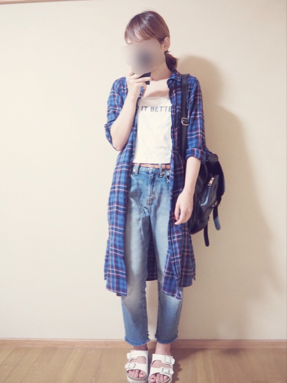 雨でもロングシャツは 暑かったああ😱🌀 GUのデニムは裾を切りっぱなしに してみました😆いい感じ💕