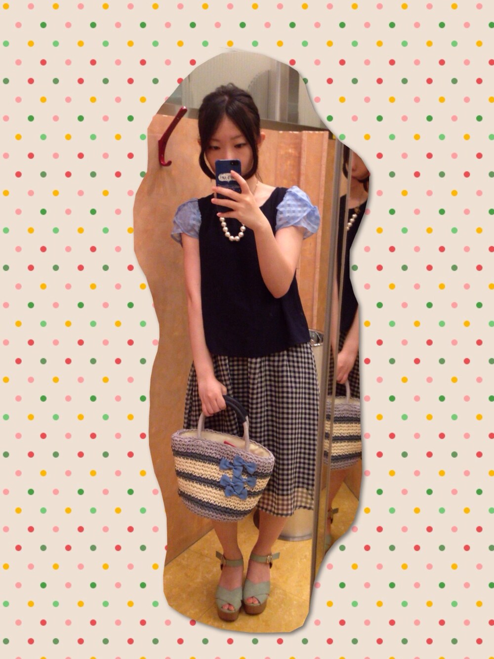 ブルーなコーディネートです☻ 肩とスカートにネイビー×水色のギンガムチェックが入ってるところがポイントです。 このかごバック1年ぶりに使う! あまり物は入らないけど…(笑)お気に入り♡ トップス:PAGE BOY スカート:Ray Cassin バック:mysty woman サンダル:LOWRYS FARM