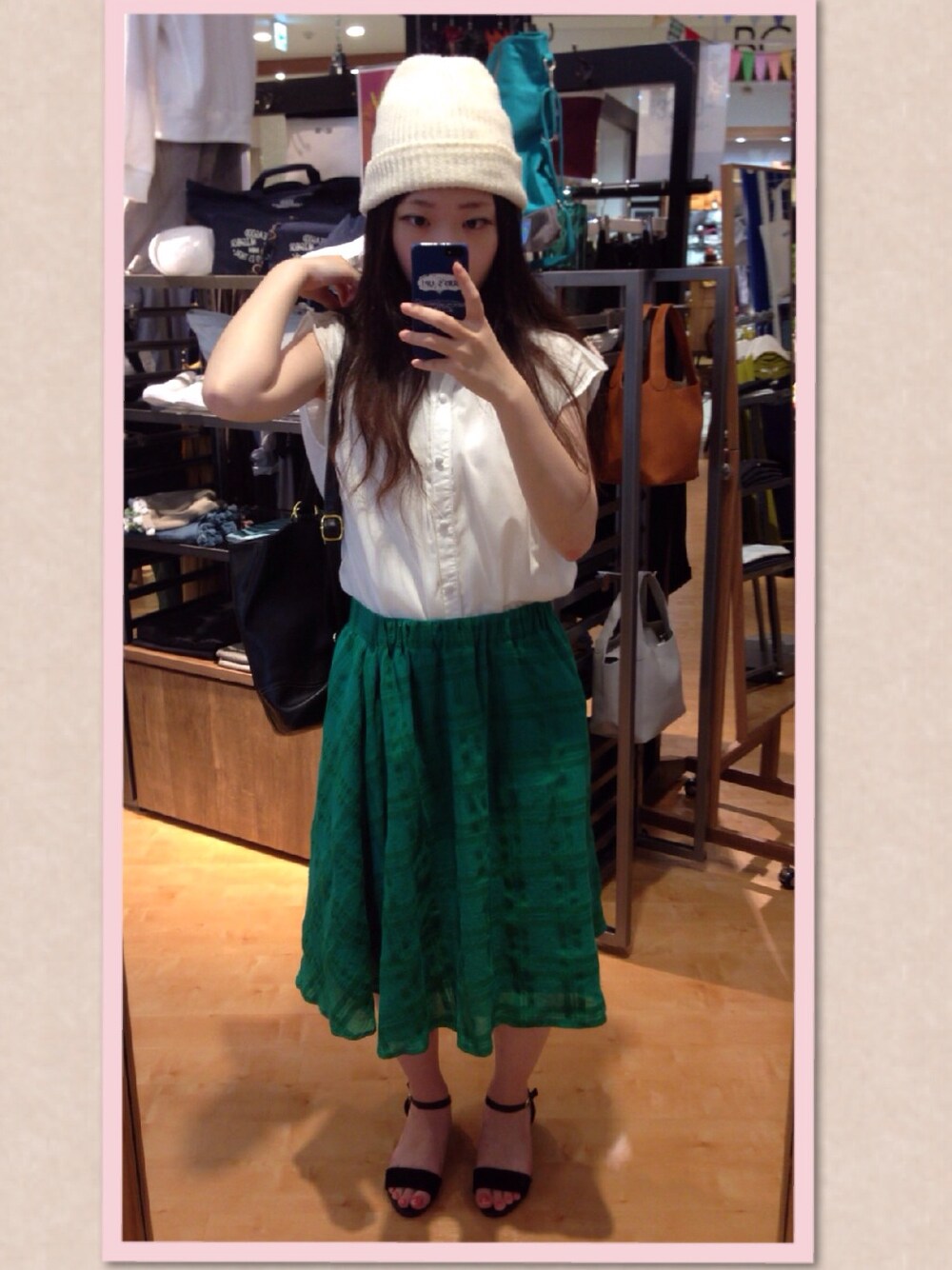 バッグの黒とサンダルの黒で引き締めてみました。 このOZOCのみどりスカートまだ全然着てない! お気に入りなのに…。 素材が夏だけど秋もいけるかな…(笑) シャツ:PAGE BOY スカート:OZOC サンダル:LOWRYS FARM