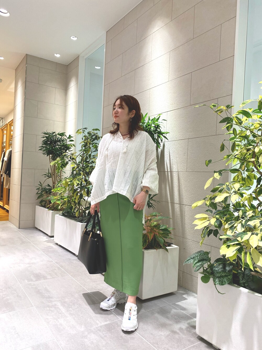 2024.04.12 こんにちは! 春らしい、綺麗なグリーンのタイトスカートを使ったコーディネートのご紹介です。 足元はSALOMONのスニーカーを合わせて、足首を見せて抜け感を出しました♪ ぜひご参考に!
