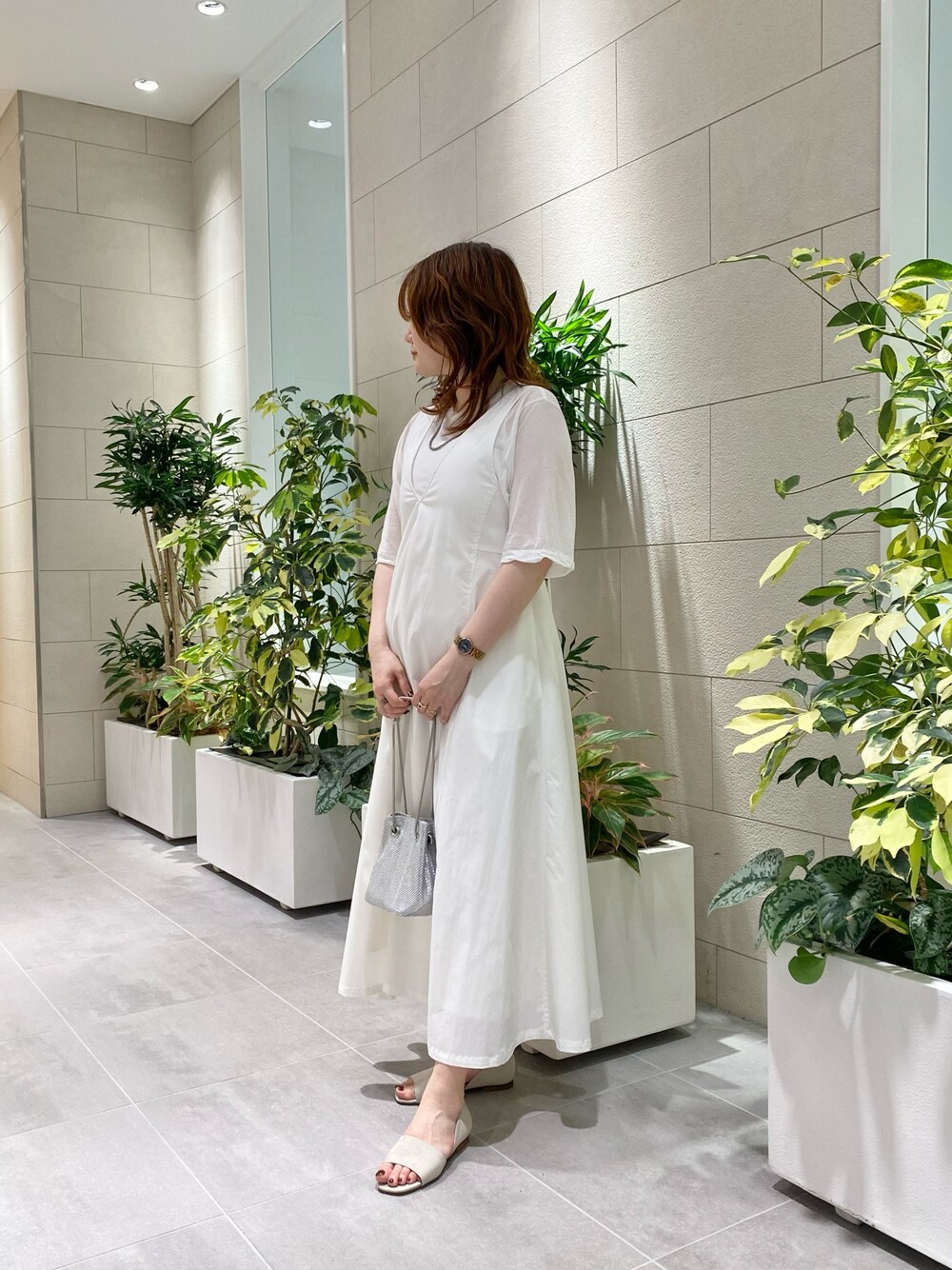 ジャンパーワンピは程よくハリ感のある生地で、胸下からたっぷり広がるので妊娠中の方にもおすすめです♪ 今回は白のシアーTシャツと合わせて同系色でまとめてみました。