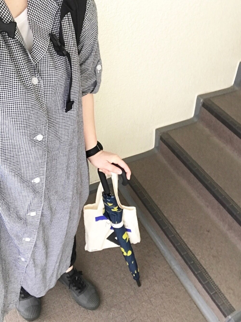 レインシューズ履いてったのに また雨降らなかったー このUNIQLOのワンピースは 前開けて羽織りでもいいし 前閉めてシャツワンピでもいいし お得感あるある 大好きなギンガムチェックが お値下げワゴンに残ってたの奇跡だな