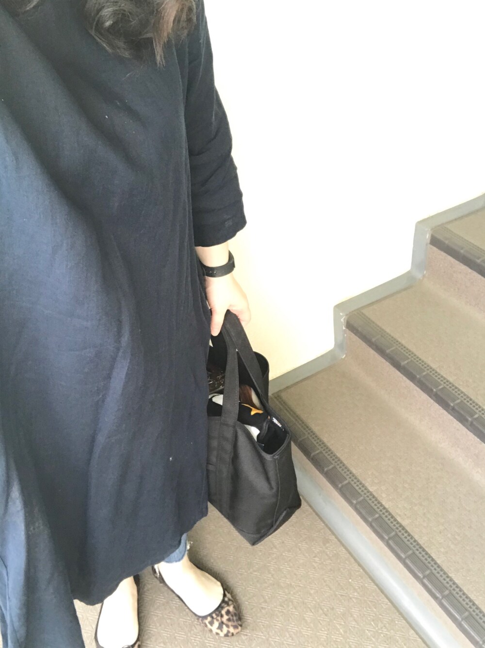 水曜日はコレ着てた リネンサックワンピ×レオパード柄バレエ 雨が降りそうでなかなか降らない日 帰るときにはけっこう降ってきた 雨の日はリネン素材に限る