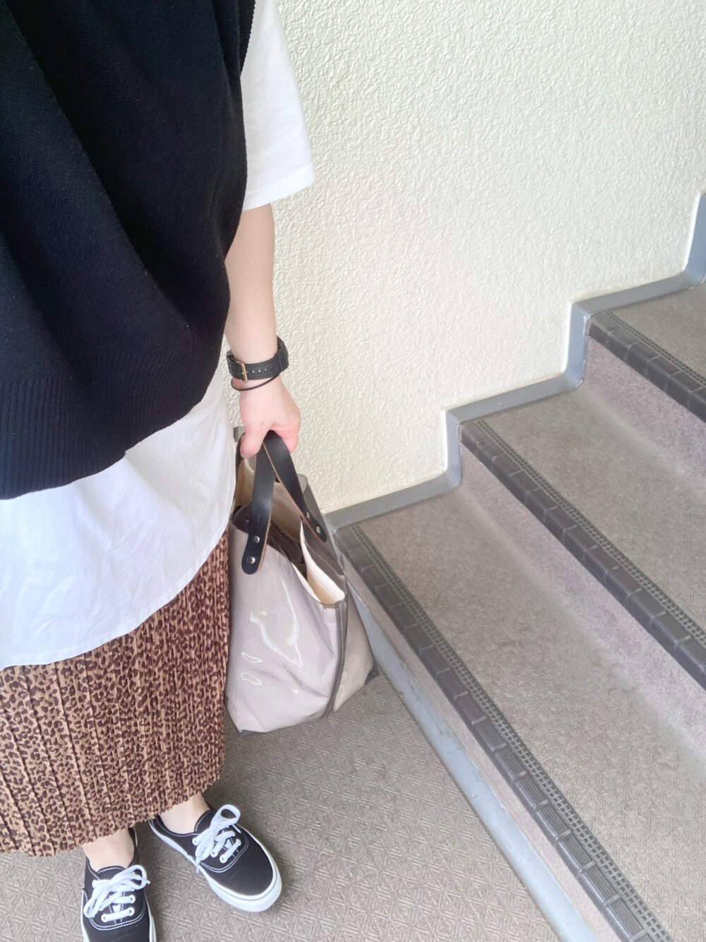 0624 ニットベストレイヤード×レオパードスカート なかなか会えない同僚が遊びに来ました 地元に立ってるのが違和感しかない笑
