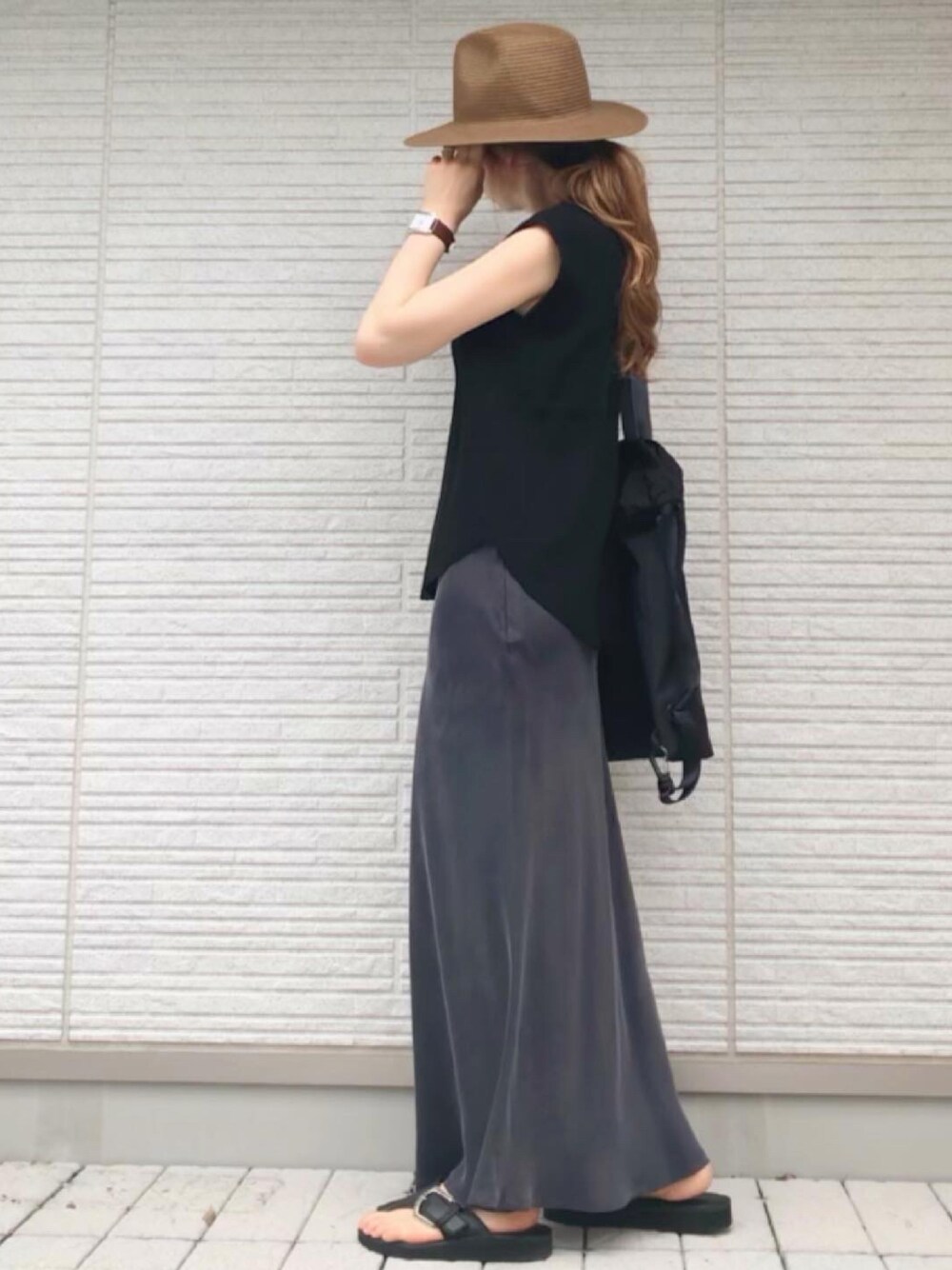 chikaのTシャツ/カットソー「さらり、大人こなれ感。オーガニックコットン ノースリーブ シンプル ハイネックリブニット」を使ったコーディネート