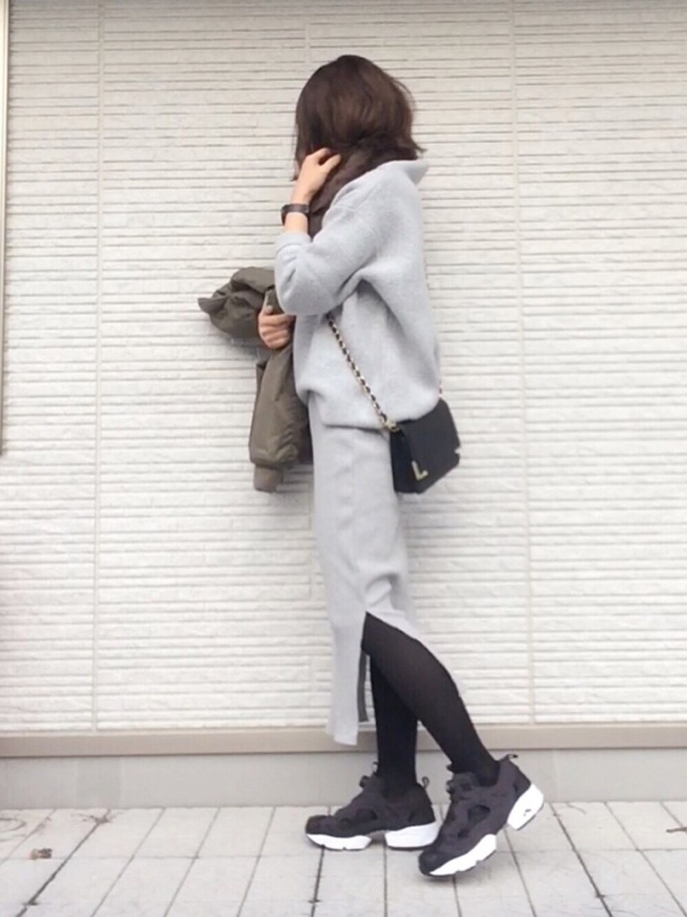 グレーのタイトスカートとニットで セットアップ風に♡ このニットゆるっと感がお気に入り♡ アウターはMA-1でした🙌 Instagram➡️chikaa25