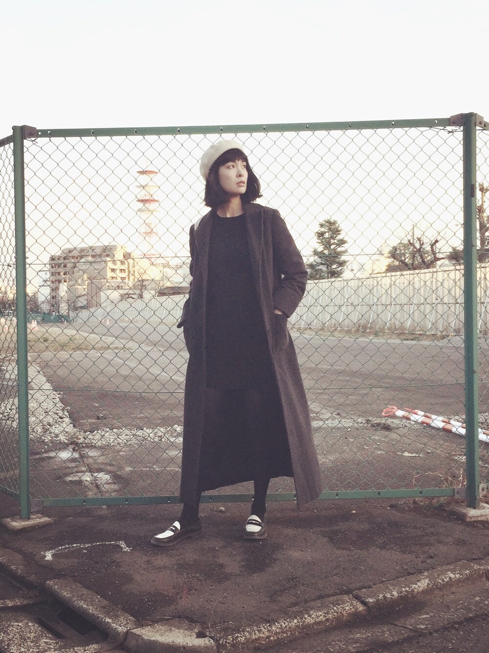 ロングコート、帽子は古着です。今日はモノトーンday