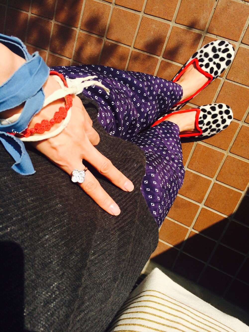 やっとおろしました。archiのパンツ。 以外に暑いのでゆるーいサマーニットで。 トップもボトムもゆるく。 ビッグシルエット好き。 赤パイピングでダルメシアン柄のもこもこ室内シューズを外履きで。 ネイビーコーデに効いてます。
