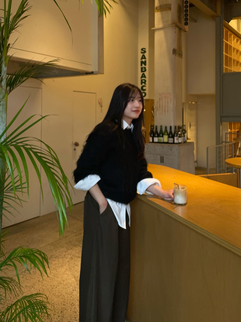 ニットにシャツを合わせて大人っぽくお洒落アップさせたスタイリングに instagram @_chikaze0209