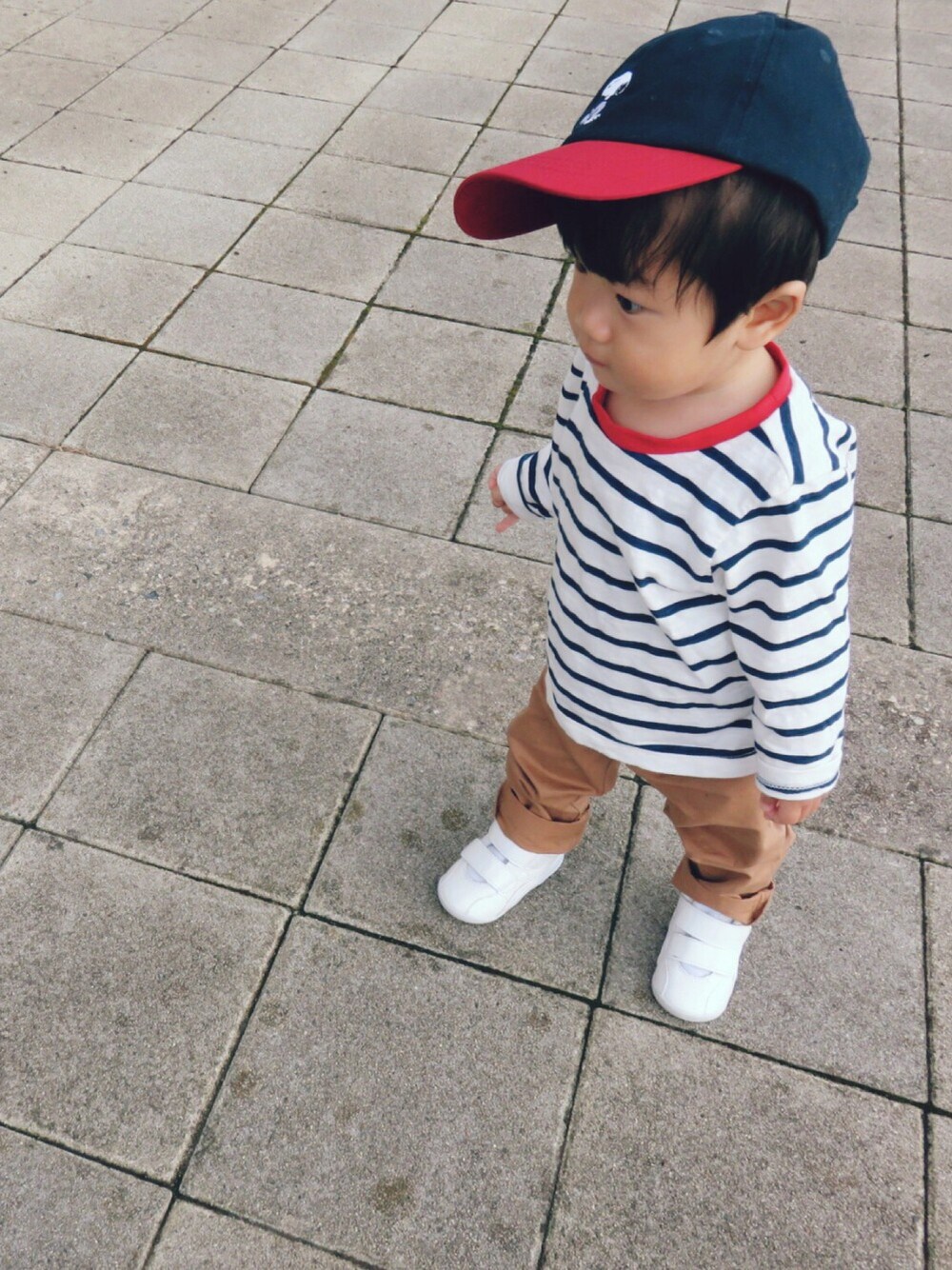 公園コーデです。スヌーピーのキャップがお気に入りです。(母が)