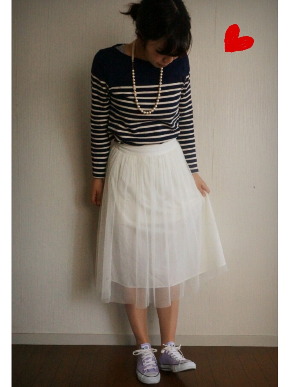 トップス: 無印良品 チュールスカート: ? スニーカー: converse ネックレス: BEAMS ラベンダー色のコンバースがお気に入り♪
