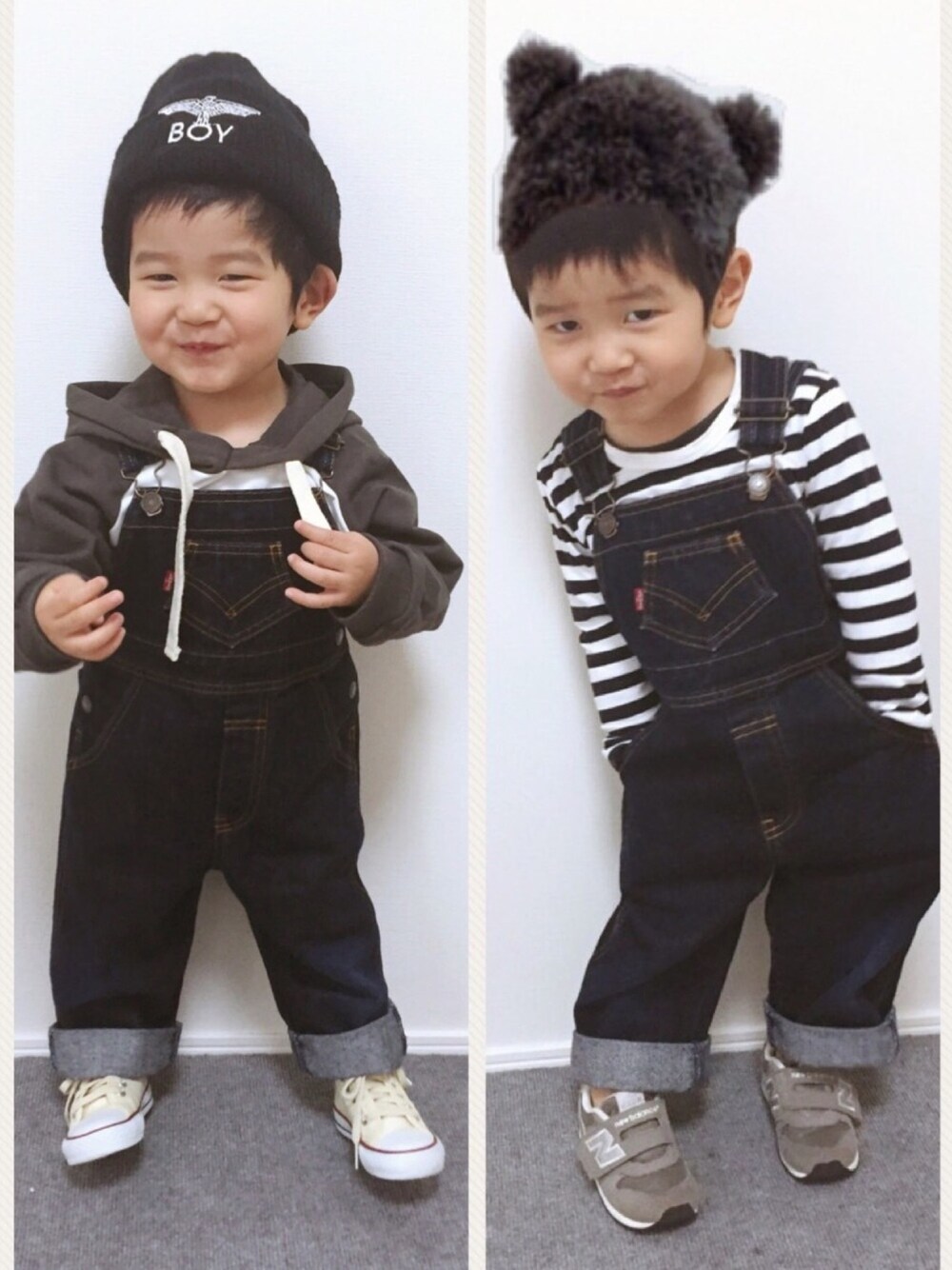 おめでとーーコーデ♡♡ 2人とも2月生まれで2歳同じー♥️☺️ 嬉しやー♡ 両方真似っ子したかったコーデ♡ るーくん☞帽子付きプルオーバー×サロペ こうきくん☞ボーダートップス×サロペ 絶対可愛いやつー🙆♀️💕 サロペ嫌がるから最近はどーかなと思ったけど、、😂なんとか笑😛 るーくん♡こうきくん♡おめでとっ♡♡ これからも成長見させてね〜〜🙋♀️✨ あっちなみにこうきくんのくま帽子合成です🤭笑♡
