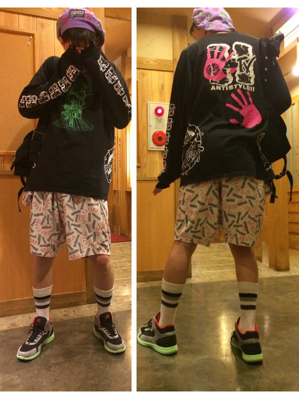 ロンT…HEX ANTISTYLE イージーパンツ…古着 鳥バッグ…ブロンドシガレッツ ヘックスの萌え袖使用のロンTはグラフィックが暗闇で光ります笑 BUTTSTAIN!のベレー帽は復刻の(´・ω・`) 寒くても半パンで滑るぜ!!