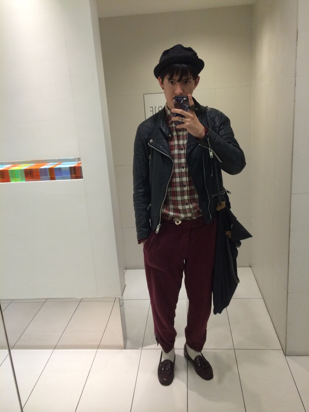 肩や肘当てのあるヴィンテージのライダースジャケットも、こんぐらい緩く着るほうが今風って感じします笑 古着のネルシャツ、ニューヨークハットの帽子でアメカジっぽさも意識しました