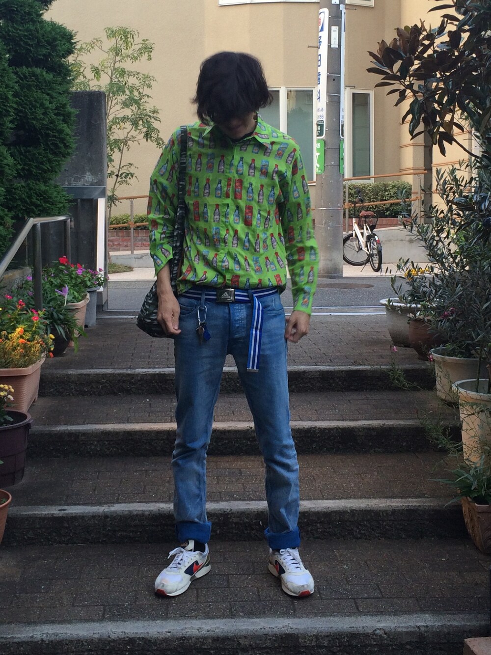 ヴェルサーチのブルージーンズの香水ボトルデザイン柄のシャツ、派手過ぎて秋感0ダサい\(^o^)/