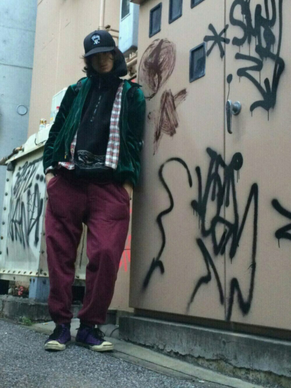 我ながら紫と緑とボルドーの変態的な色使いやべぇ😎😈 オールドサーフな感じでアウターのベロアブルゾン脱いだ別の日のバージョンも載せときます ヘリーハンセンの90sのフリースパーカー、イルカ柄でかわいい(^ω^)